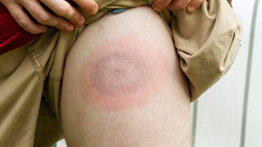 Typisch ist eine kreisförmige Hautrötung nach einem Zeckenstich, begleitet von grippeähnlichen Symptomen.