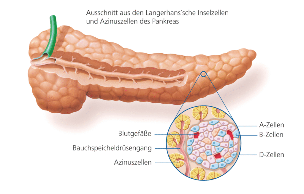 Neben der Verdauung hat das Pankreas eine endokrine Funktion. In kleinen Zellinseln, den sogenannten Langerhans-Inseln, werden Hormone produziert. Diese Hormone steuern den Blutzuckerspiegel. Insulin senkt den Blutzucker, während Glukagon ihn anhebt. Zusammen sorgen sie für ein stabiles Gleichgewicht, das für die Energieversorgung aller Zellen notwendig ist.
